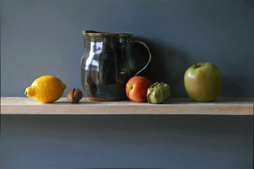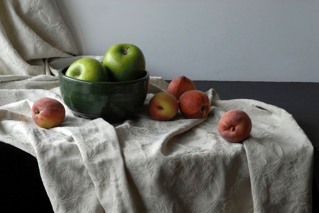 我拍靜物就起於一次偶發事件。有一天我在家,踩在地板上的一滴水滑到,左膝蓋一條小骨斷了,做手術後,呆在家中養傷。一天我把幾個梨子隨意放在牆上的袈子上,第二天早上,發現那幾個梨子在一線晨光中,完全改變了樣子,用相機拍下來,成為我第一張靜物攝影。《五個梨子》,這就是光的作用。