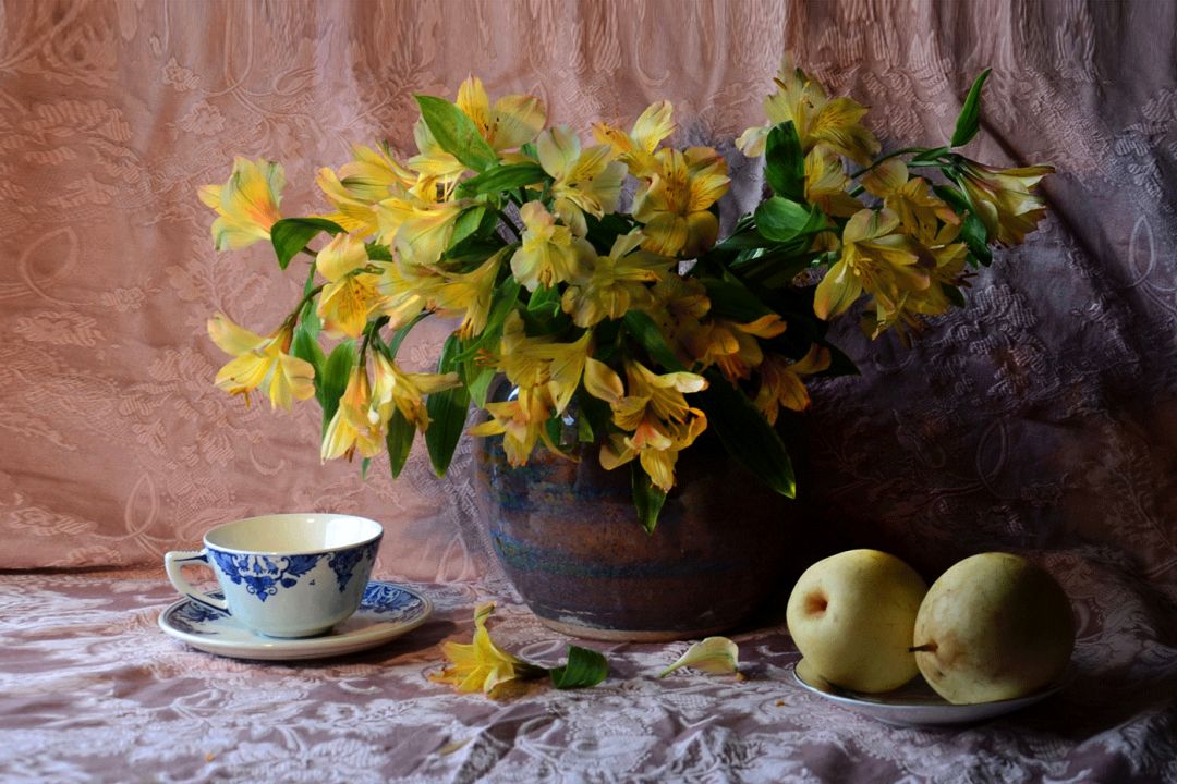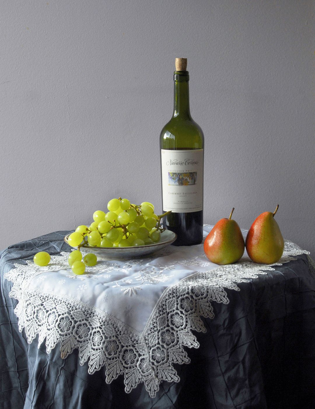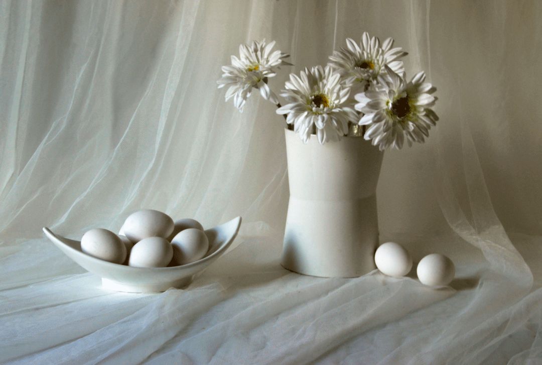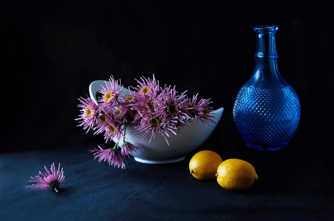 對靜物拍攝產生靈感後,一發不可收拾。我每天一早起來,把從舊物市場收集的工藝品反復組合擺設,使用不同的物質如金屬,石膏,玻璃,塑膠,陶瓷,木製品,紡織品包括麻,布,絲,綢,緞,化纖等。並採用了不同的花,水果,蔬菜,果實等,每樣都作了精心的選擇,用不同的形狀和色彩的配搭,強調光的效果,多採用較暗的背景,突出學主題,並運用Photoshop作後期處理,畫面作適當的調整,盡量使其完美。現有靜物作品100多張。希望能出版。